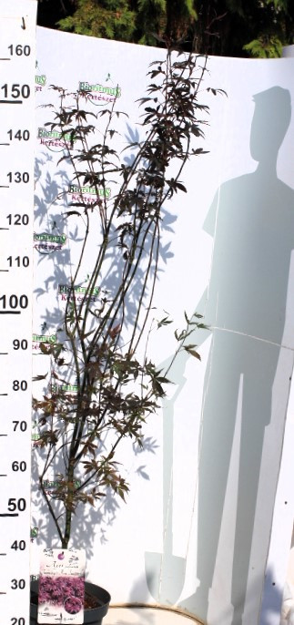Levelei tenyérszerűen szeldeltek, tavasszal élénkpiros színben fakadnak, nyáron mélybordó árnyalatot öltenek, majd ősszel ragyogó skarlátvörösre színeződnek. E színváltozás az évszakok során folyamatos díszítőértéket ad, ezért a növény a kert fókuszpontja lehet. Sűrű lombja és különleges, keskeny formája miatt kiválóan alkalmazható térhatárolóként, illetve modern kertekben hangsúlynövényként.