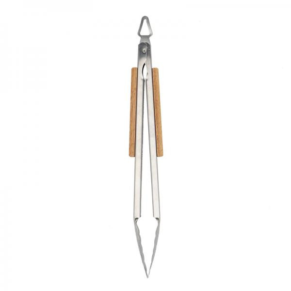 Rozsdamentes acél BBQ grill fogó csipesz, fa nyél borítással, 49 cm hosszúságban. Praktikus grillcsipesz, mely a szabadtéri, kerti sütés-főzés elengedhetetlen kelléke! Hosszított kialakítása megóvja kezünket az égési sérülésektől, a fogó végének különleges kialakítása pedig meggátolja, hogy az ínycsiklandó falatok forgatás közben kicsússzanak a csipesz fogásából. A grillcsipesz nyelének borítása kőrisfából készült, így a csipesz fogása stabil, kényelmes, a fogó nem melegszik át. Használaton kívül a fém akasztónak köszönhetően egyszerűen tárolható.