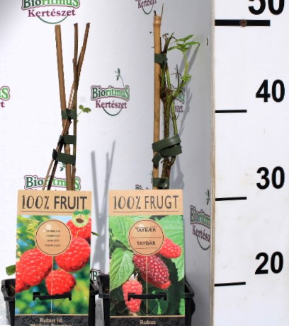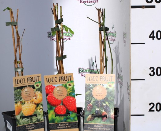 Bogyós válogatás, Thornless Evergreen (tüskementes szeder), Autumn Bliss (málna), Fallgold (málna), Thornfree (tüskementes szeder), Heritage (málna), Tayberry (szedermálna), Malling Promise (málna) fajtákból.